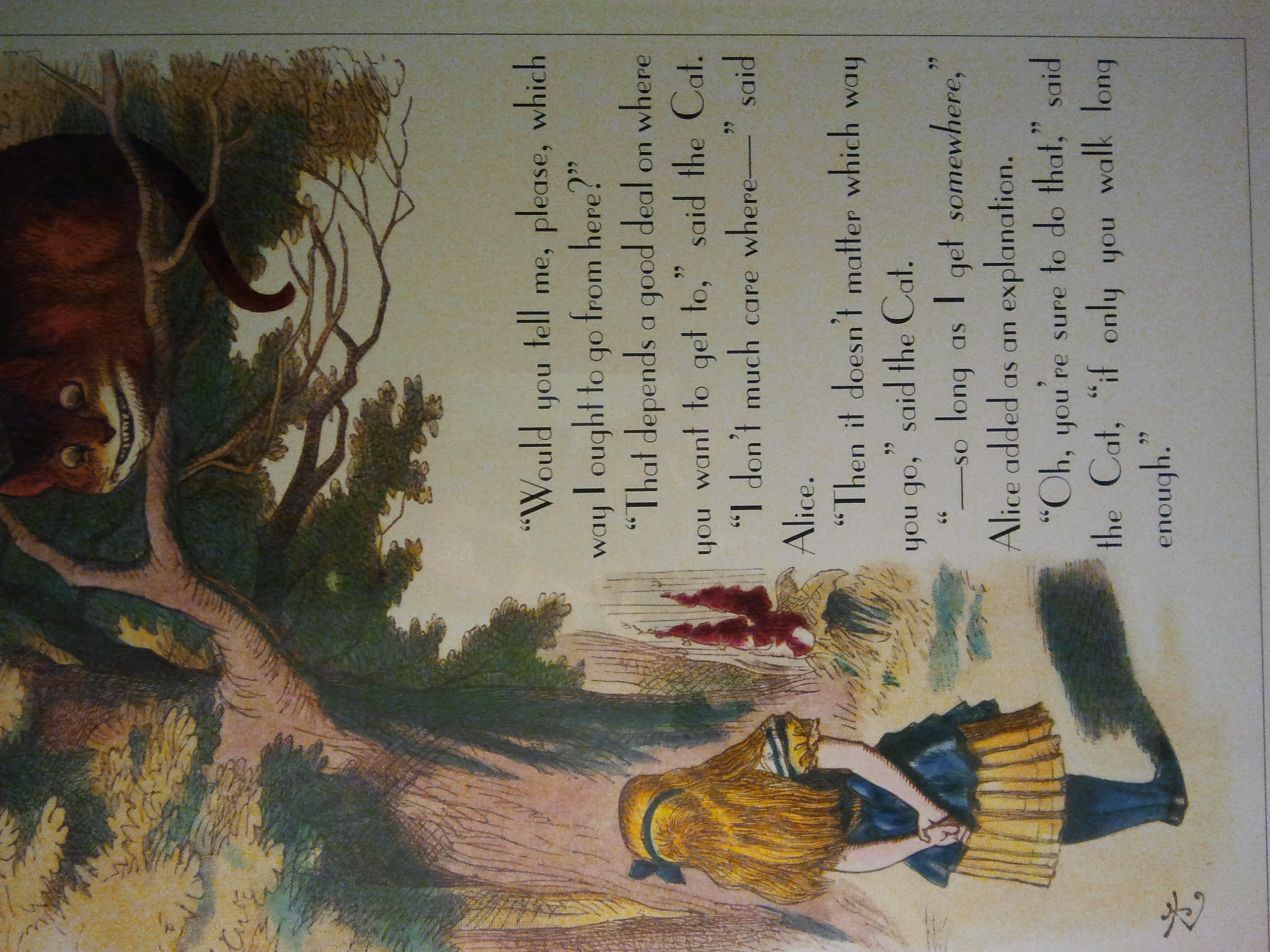 Those who have read Alice in Wonderland may know the Cheshire Cat as a mysterious and baffling being. The Cat often makes some very good points, although rarely in a very helpful way. One is in the picture below. Unfortunately, I took it with my phone, and the text is a little blurry.  So I transcribed it.